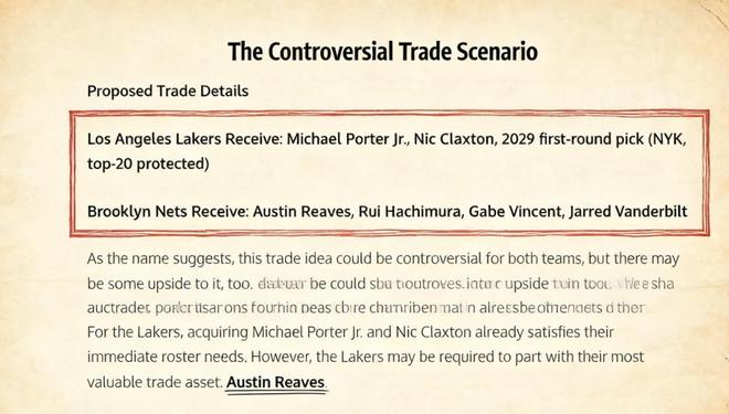 美媒《Fadeaway World》撰文建議,湖人可以將裡夫斯、八村壘、文森特以及范德比爾特送到佈魯克林,換回小波特、克拉克斯頓以及2029年首輪簽(前20順位保護)。